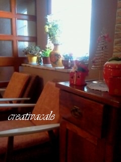 Ovo je stara metalna stolica koja se podize.Bilo mi je zao da je bacim.Metalni deo je isprskan crnim spejom (auto lak).A stalak za novine je dobijen za jednu slavu.Kupljen u prodavnici za 1 evro.Materijal je bio onaj papirni.Isekla sam ga i napravila snit i po njemu sasila od istog materijala.Od tog materijala sam sasila i zavesu za kuhinju.Fotografisacu je.Planiram i dva mala okrugla jastuceta,koja bih stavila na ove dve foteljice,kao naslon za vrat.